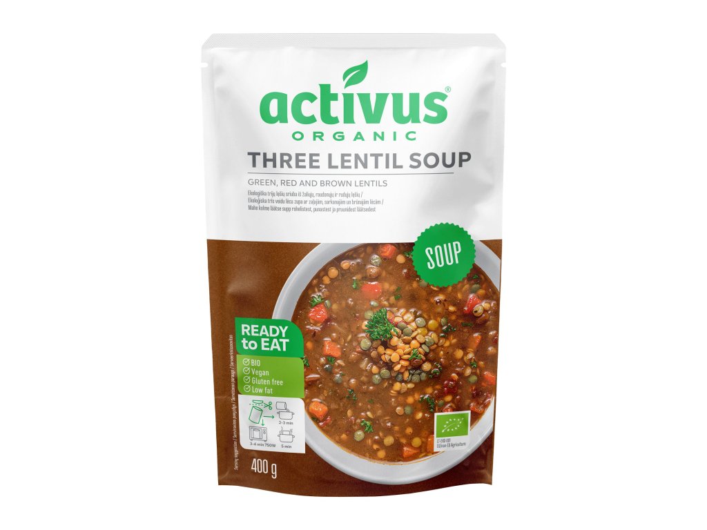 Activus BIO леща супа съчетава три вида леща – червена, зелена и кафява – в хармонична смес от вкусове и хранителни вещества. Тя е идеалното решение за бърз и питателен обяд или вечеря, по всяко време на деня. Не съдържа изкуствени консерванти, ароматизанти или добавена захар, така че можете да сте сигурни, че ядете чиста храна без компромис. Супата е подходяща за вегани и всеки, който търси естествен източник на растителни протеини. Леката опаковка в плик е по-екологична алтернатива на стъклото или консервите и има значително по-ниски емисии на CO₂.