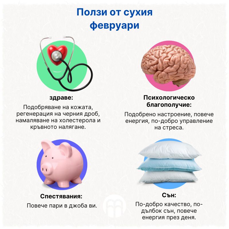 Здравословни ползи: Здравето е една от основните причини, поради които хората решават да участват в Сухият февруари. След месец без алкохол се наблюдават много положителни промени в тялото. Подобрява се качеството на кожата, тя става по-стегната, изчезва дехидратацията, която често се проявява със суха коса и уморен вид. Освен това редовната консумация на алкохол е пряко свързана с увреждане на черния дроб, което може да доведе до развитие на стеатоза и цироза на черния дроб. При изключване на алкохола черният дроб има време за регенерация и подобряване на функциите му.1 Ще се намали нивото на холестерола в кръвта и кръвното налягане.