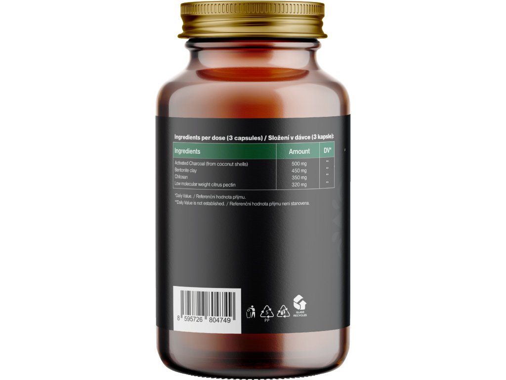Състав: Бентонитова глина, активен въглен от кокосови черупки, цитрусов пектин с ниска молекулна маса, хитозан.