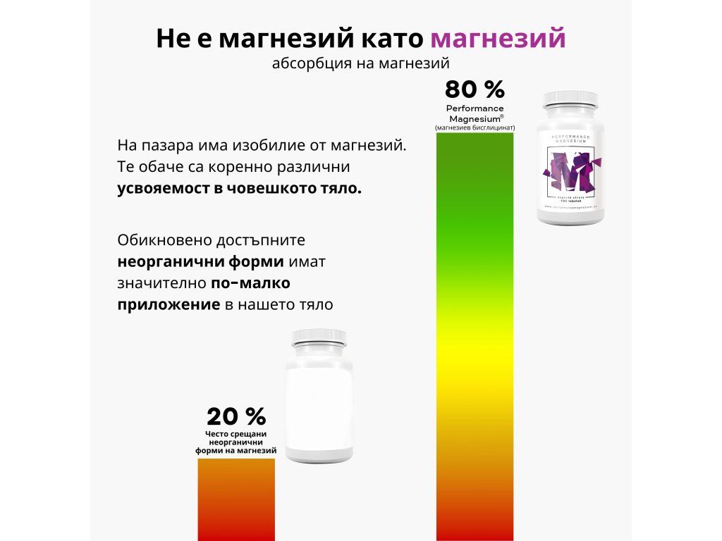 И двата продукта се базират на същата основа – магнезий MagChel® във формата на бисглицинат с висока абсорбция. Performance Magnesium® комбинира 200 mg магнезий с витамин B6 (P5P) за подкрепа на нормалния енергиен метаболизъм и регенерация. Sleep Magnesium® добавя към 320 mg магнезий също така GABA, L-theanin и сок от вишни и се гордее с това, че допринася за нормалната психическа дейност1,2.