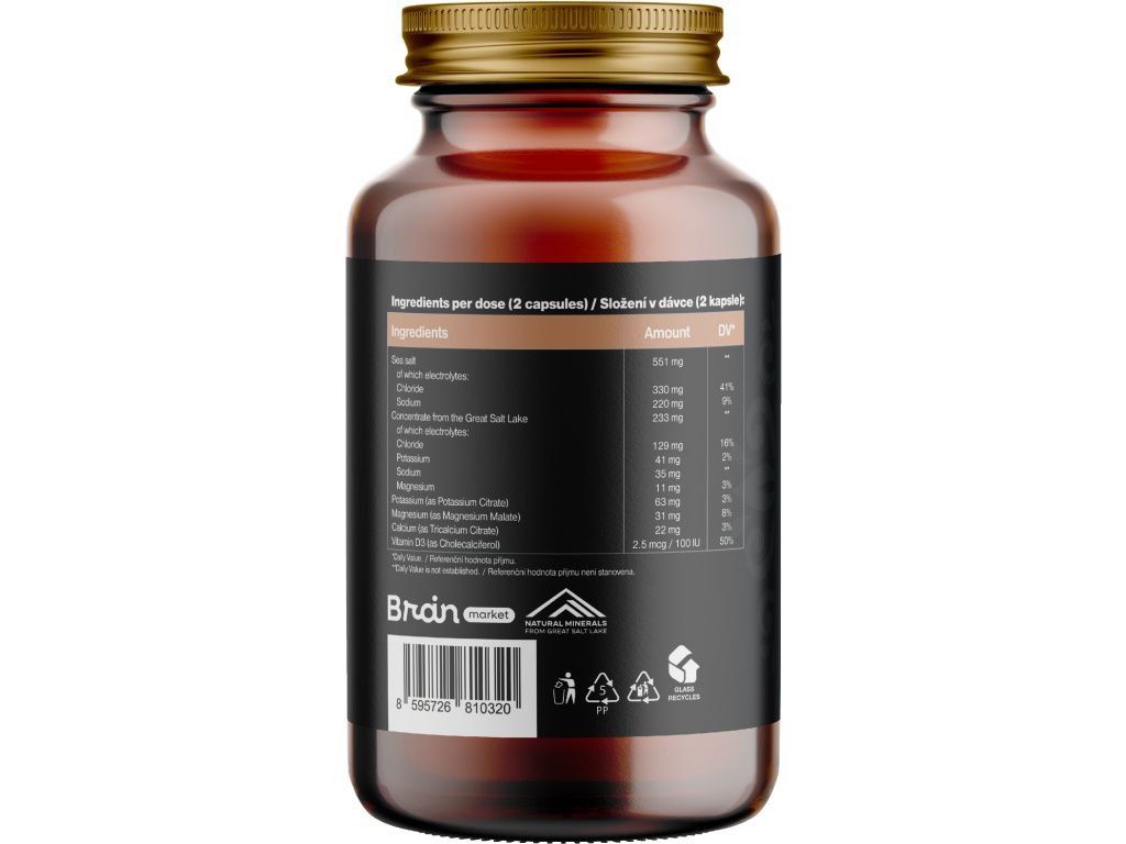 Състав: Морска сол (551 mg,РКП), от който хлорид (330 mg,РКП 41%), от който натрий (220 mg,РКП 9%), минерали и следи от RH P), от който магнезий (11 mg,РКП 3%), калий (като калиев цитрат) (63 mg,РКП 3%), магнезий (като магнезиев малат) (31 mg,РКП 8%), калций (като трикалциев цитрат) (22 mg,РКП 3%), витамин D3 (AS Cholecalcelciferol) (2.5 mcg /100 iu, RHOLP). HPMC базирана растителна капсула. Не съдържа никакви баластни вещества (E-номери).