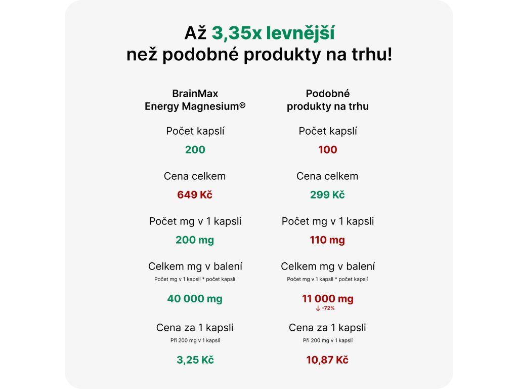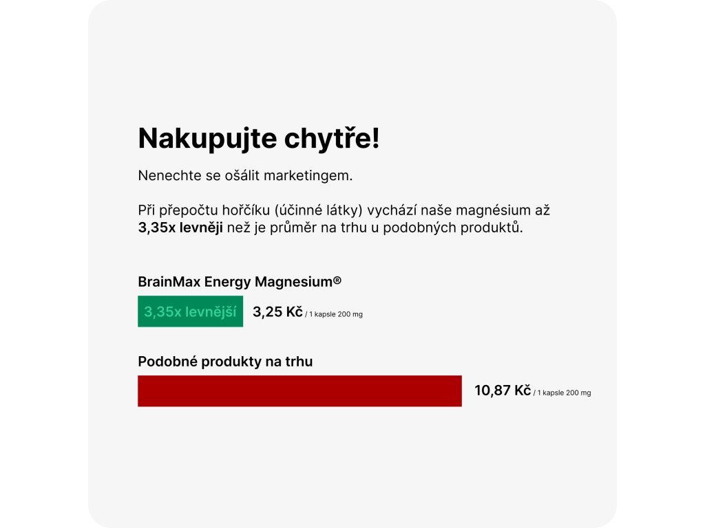 Пазарувайте умно и не се заблуждавайте от маркетинга. Когато се превърне в магнезий (активна съставка), нашият магнезий е до 3,35 пъти по-евтин от средното на пазара за подобни продукти. BrainMax Energy Magnesium® струва само 3,25 CZK за 1 капсула (1000 mg) , докато средната цена на подобни продукти на пазара е 10,87 CZK за 1 капсула (1000 mg).