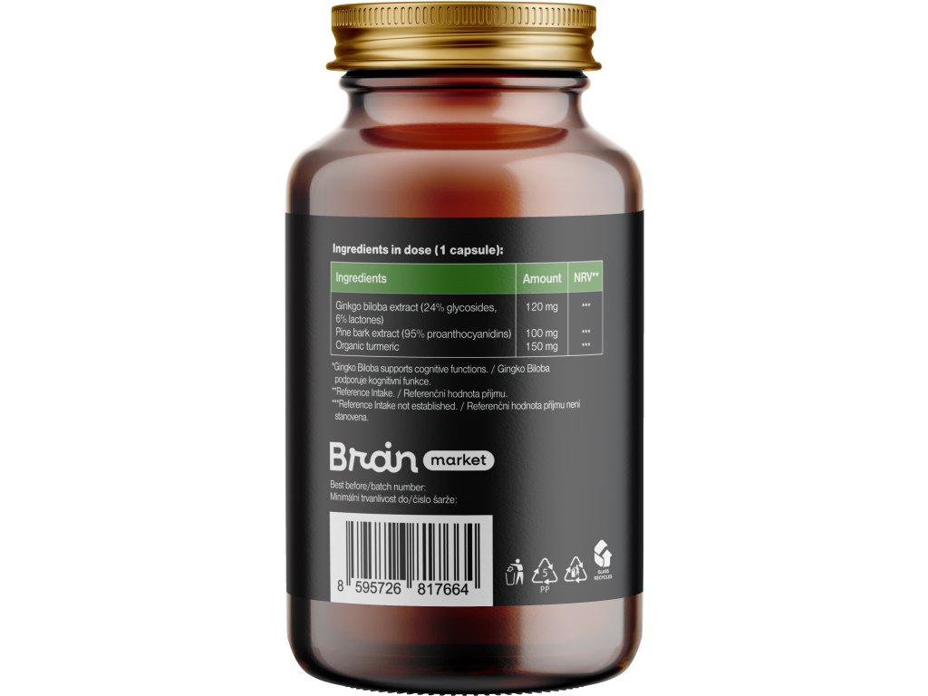 Съставки на доза (1 капсула): екстракт от гинко билоба (120 мг, ПДВ ***), екстракт от борова кора (pinus pinaster) (95% проантоцианидини) (100 мг, ПДВ ***), органична куркума (150 мг, ПДВ ***). Растителна капсула на базата на HPMC. Не съдържа баластни вещества.