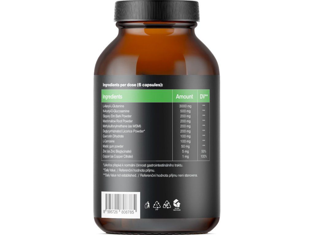 Състав: L-Аланил-L-Глутамин (2750 mg, NRV **), N-Ацетил-D-Глюкозамин (500 mg, NRV **), Прах от кора на бяла черница (200 mg, NRV **), Прах от корен на лечебен руж (200 mg, NRV **), MSM (Метилсулфонилметан) (200 mg, NRV **), DGL (Деглициризирано екстракт от корен на сладник) (200 mg, NRV **), Кверцетин (100 mg, NRV **), Екстракт от алое вера 200:1 (100 mg, NRV **), L-Карнозин (100 mg, NRV **), Прах от мастихова смола (50 mg, NRV **), Цинк (цинков пиколинат) (5 mg, NRV 50 %), Мед (като меден цитрат) (1 mg, NRV 100 %). Растителна капсула на основата на HPMC. Без съдържание на баластни вещества.