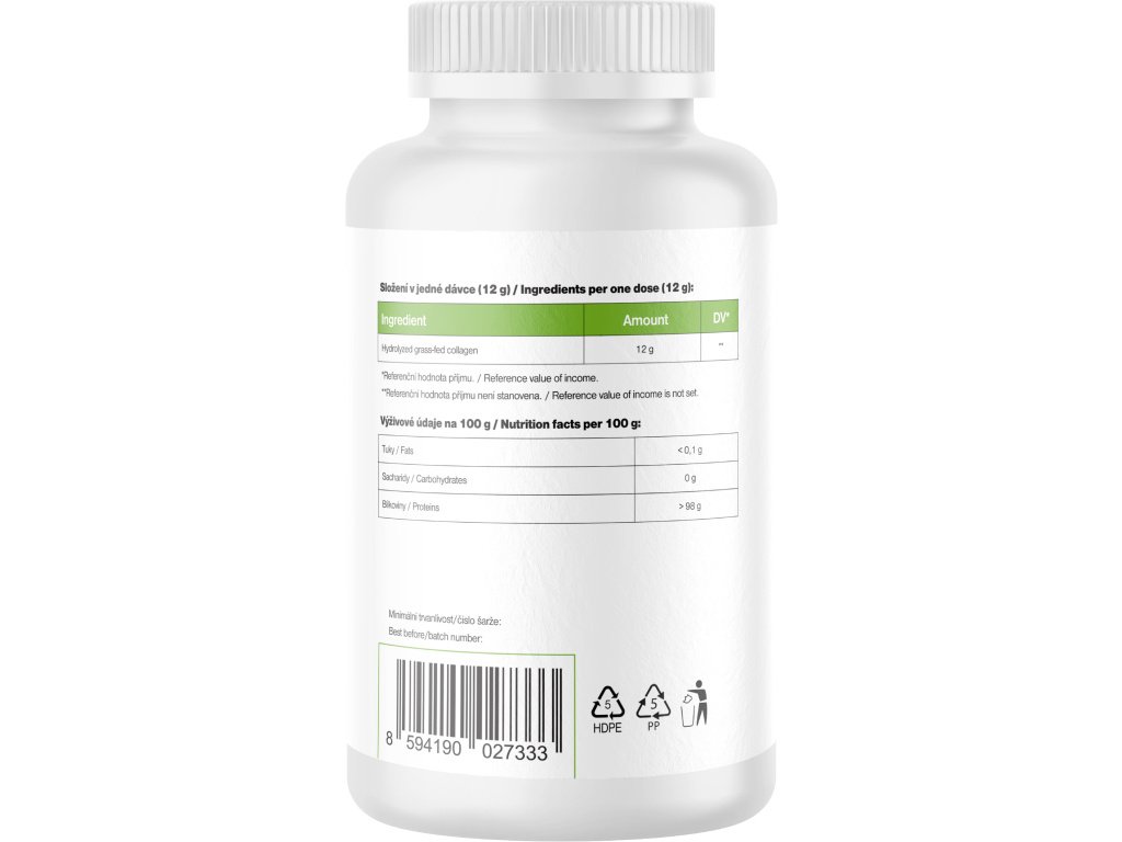 Състав: 100% хидролизиран колаген от крави, хранени с трева. Хранителна информация за 100 g: Мазнини: < 0,1 g, въглехидрати 0 g, протеини: > 98 g.
