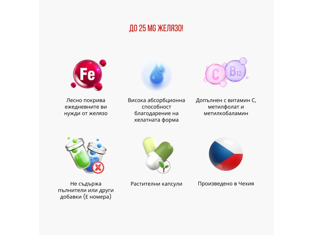 25 mg желязо в лесно усвоима форма във всяка капсула