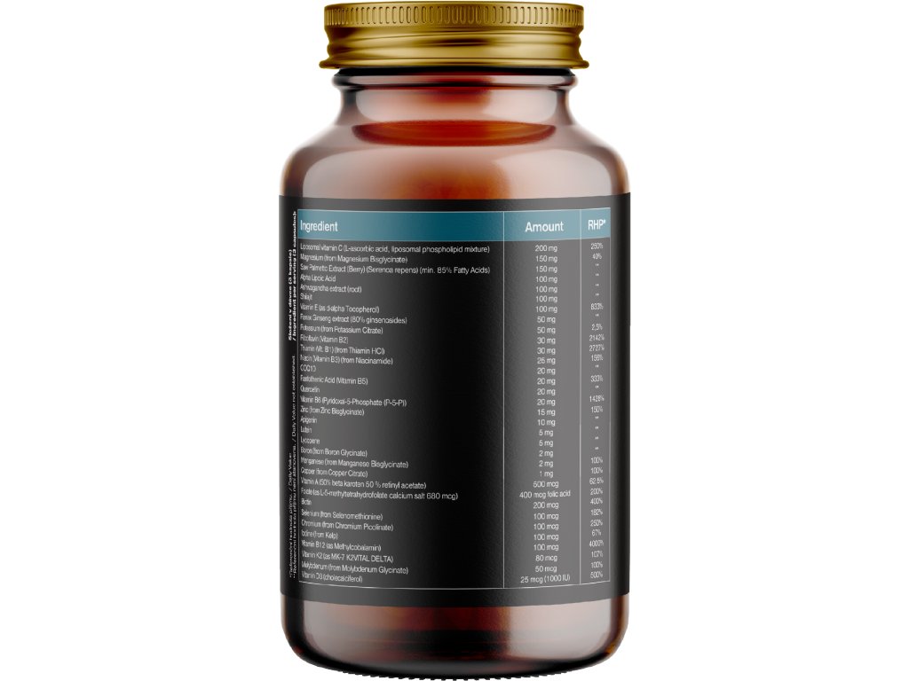 Съставки: Липозомен витамин C (аскорбинова киселина), липозомна фосфолипидна смес, магнезий (от магнезиев бисглицинат), екстракт от Saw Palmetto (плод) (Serenoa creeping) (мин. 85% мастни киселини), алфа-липоева киселина, екстракт от корен на Ашваганда, шиладжит, витамин E (като ди-алфа-токоферол), екстракт от сибирски женшен, калий от калиев цитрат, рибофлавин (витамин B2), тиамин (витамин B1) (от тиамин HCl), ниацин (витамин B3) (от ниацинамид), коензим Q10, пантотенова киселина (витамин B5), кверцетин, витамин B6 (пиридоксал-5-фосфат), цинк (от цинков бисглицинат), лутеин, ликопен, бор (от боров глицинат), манган (от манганов бисглицинат), мед (от меден цитрат), витамин А (50% бета-каротин, 50% ретинил ацетат), фолат (като калциева сол на L-5-метилтетрахидрофолат), биотин, селен (от селенометионин), хром (от хромов пиколинат), йод (от водорасли Kelp), витамин B12 (метилкобаламин), витамин K2 (като MK-7 K2VITAL DELTA), молибден (от молибденов глицинат), витамин D3 (холекалциферол). Растителна капсула на базата на HPMC. Без баластни вещества.