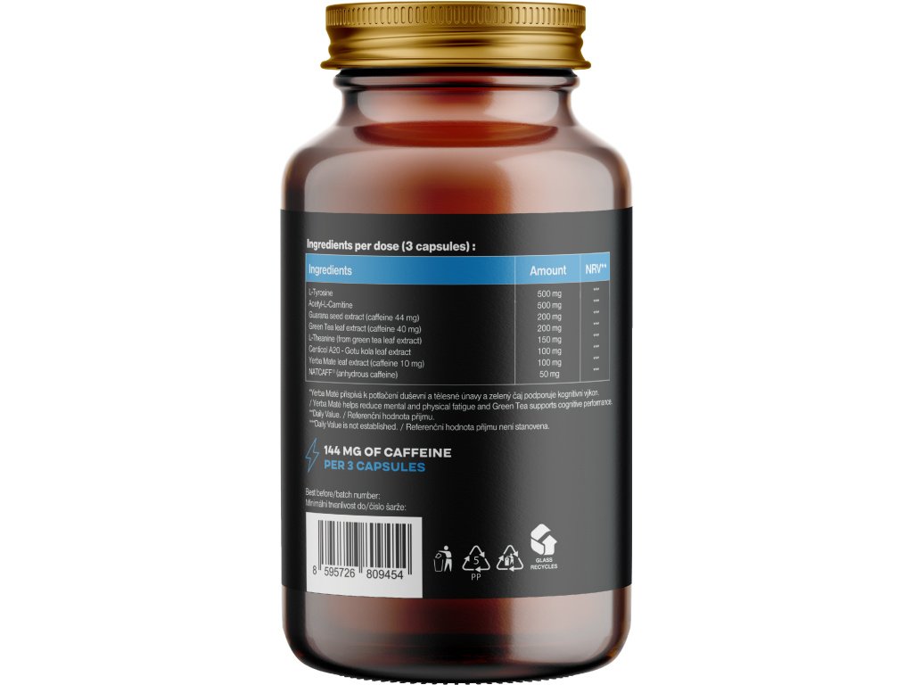 Състав: L-тирозин (500 mg, NRV **), Ацетил-L-карнитин (500 mg, NRV **), Екстракт от семена на гуарана (200 mg, от тях кофеин 44 mg, NRV *), Екстракт от зелен чай (200 mg, от него кофеин 40 mg, NRV *), L-теанин (от екстракт от листа на зелен чай) (150 mg, NRV *), Екстракт от Готу кола (Centella asiatica) като Centicol A20 (100 mg, NRV *), Екстракт от листа на Йерба Мате (100 mg, от тях кофеин 10 mg, NRV *), NATCAFF® безводен кофеин (50 mg, NRV *).