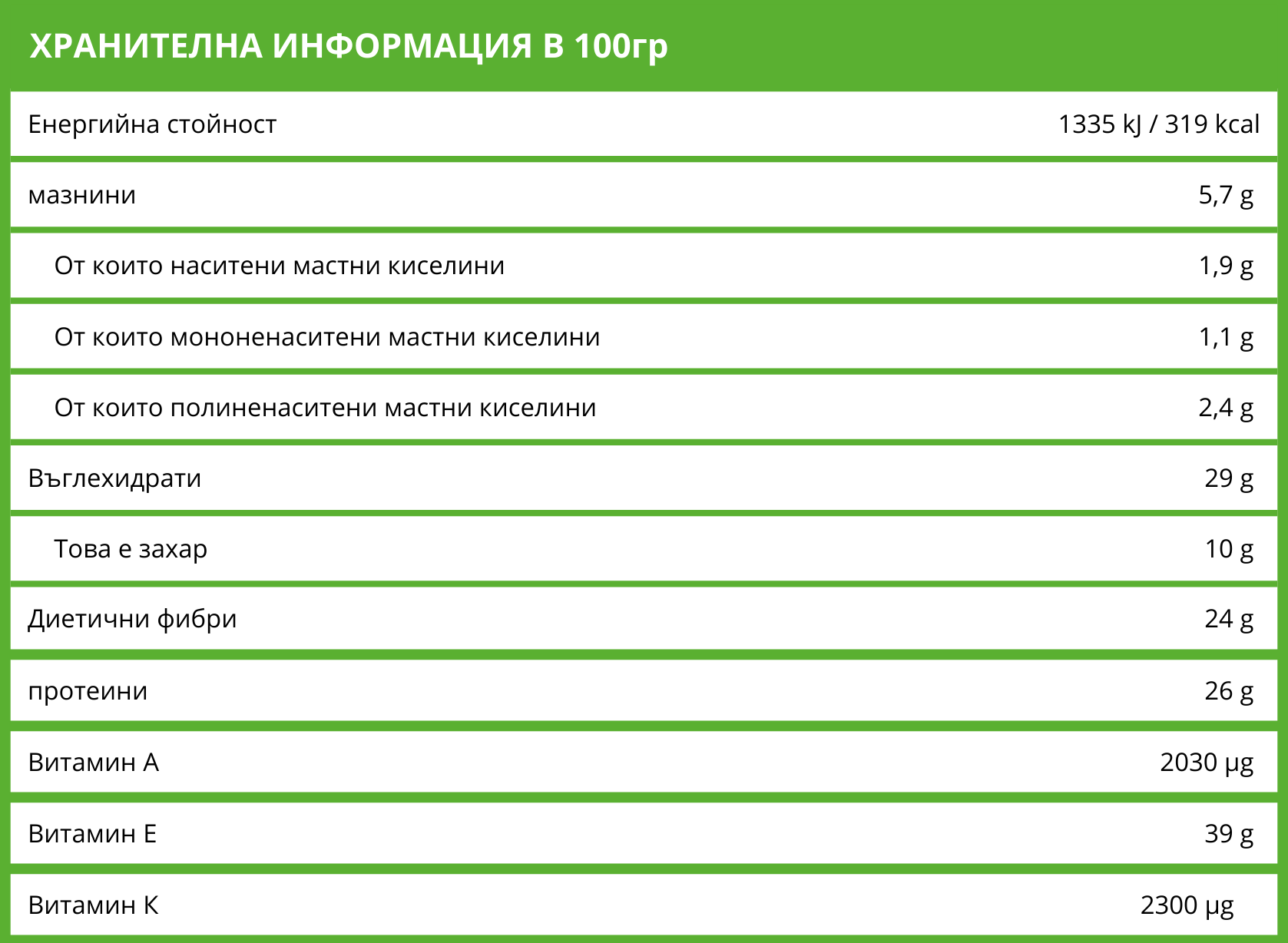 Богат източник на хлорофил, който е мастноразтворим пигмент, който придава типичния цвят на растенията и в допълнение към протеини е богат на антиоксиданти.