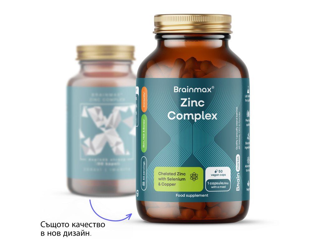 Zinc Complex® съдържа 15 mg цинк под формата на бисглицинат, 1 mg мед като меден цитрат, 100 µg селен като L-селенометионин и 420 mg био куркума. Цинкът допринася за нормалната функция на имунната система, за защитата на клетките от оксидативен стрес, за нормалната плодовитост и репродукция, за поддържането на нормално ниво на тестостерон в кръвта и за нормалното състояние на кожата, косата и ноктите. Селенът допринася за нормалната функция на щитовидната жлеза, за защитата на клетките от оксидативен стрес и за нормалната сперматогенеза. Медта допринася за нормалното пренасяне на желязото в тялото и за нормалния енергиен метаболизъм.
