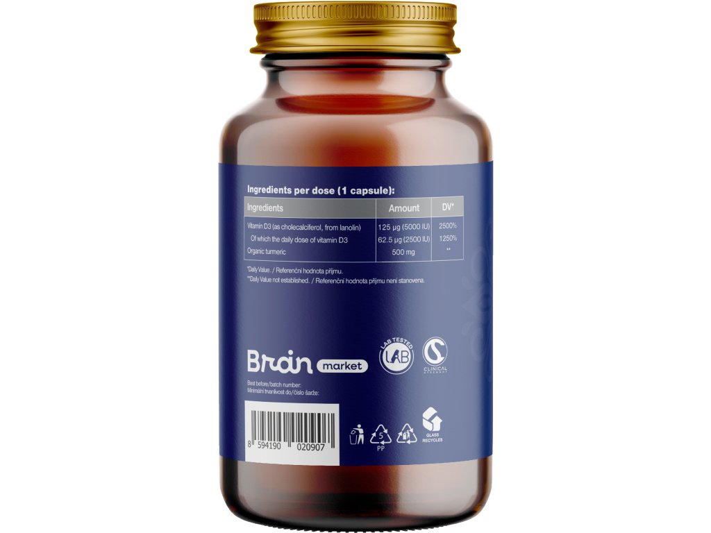 Комбинацията от висока доза витамин D3 (5000 IU) и био куркума (500 mg) предоставя изключителна подкрепа за имунната система, костите и мускулите. Витамин D3 в най-добре усвоимата форма от ланолин осигурява оптимално ниво на „слънчевия“ витамин дори през зимните месеци, докато био куркумата действа като силен антиоксидант, който подпомага нормалната функция на черния дроб и имунната система. Тази растителна капсула представлява научно обоснована комбинация от две активни съставки за енергия, сила и устойчивост всеки ден.
