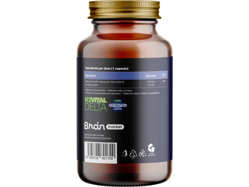 BrainMax Витамин K2 като MK7 all-trans K2VITAL®DELTA 150 mcg, 100 растителни капсули Високоусвоима и използваема патентована форма на витамин K2 MK-7, хранителна добавка