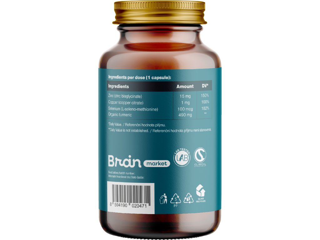 Съставки: цинков бисглицинат, меден цитрат, L-селенометионин, органична куркума. Растителна капсула на базата на HPMC. Не съдържа баластни вещества (E-номера).