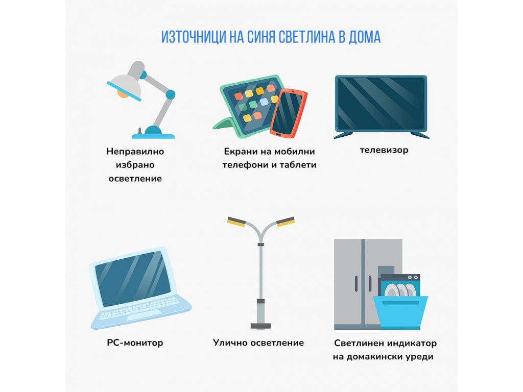 - Прекомерното насищане на синя светлина може да намали зрителната острота и да затрудни фокусирането.