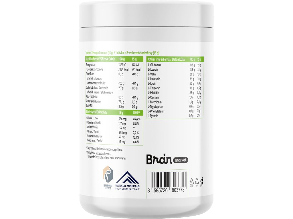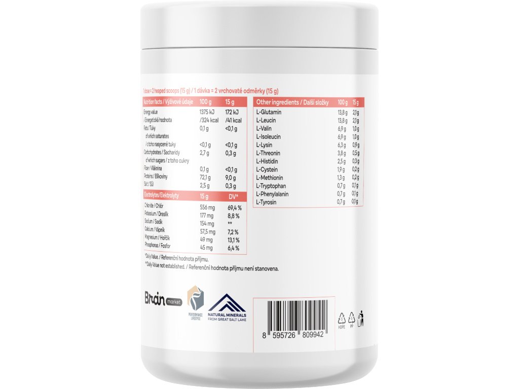 Състав: L-глутамин, L-левцин, лимонена киселина, BIO инулин, естествен аромат, L-валин, L-изолевцин, електролити и микроелементи от Голямото солено езеро в Юта (хлорид, калий, натрий, магнезий и други естествено срещащи се електролити и микроелементи), L-лизин HCl, L-треонин, L-хистидин, подсладител: стеви ол гликозиди, L-цистеин HCl, L-метионин, L-триптофан, L-фенилаланин, L-тирозин. Изчислените стойности са закръглени средни, включително естествените вариации на суровините.