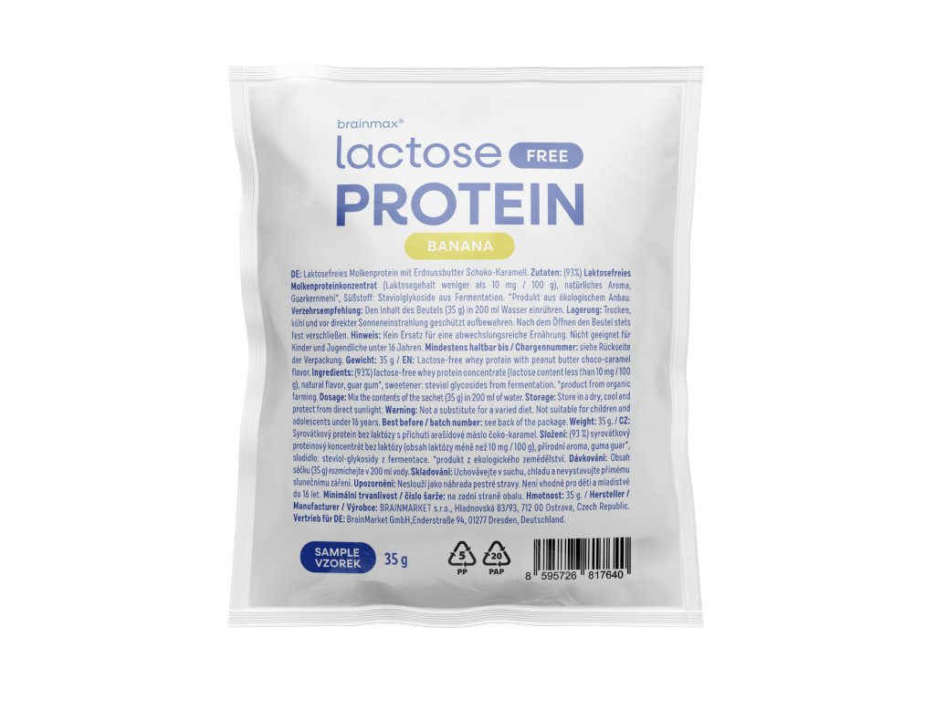 Протеините без лактоза BrainMax са направени от 93% суроватъчен протеинов концентрат , който предлага изключително високо съдържание на протеини и отлична смилаемост. Благодарение на високото си съдържание на протеини и чистия си състав без излишни съставки , той съдържа почти 26 г протеин в една порция . Подсладен е със стевия и овкусен с естествен бананов аромат. Без изкуствени подсладители, пълнители и консерванти. Резултатът е лек, хранителен и вкусен протеин, който се усвоява лесно от организма.