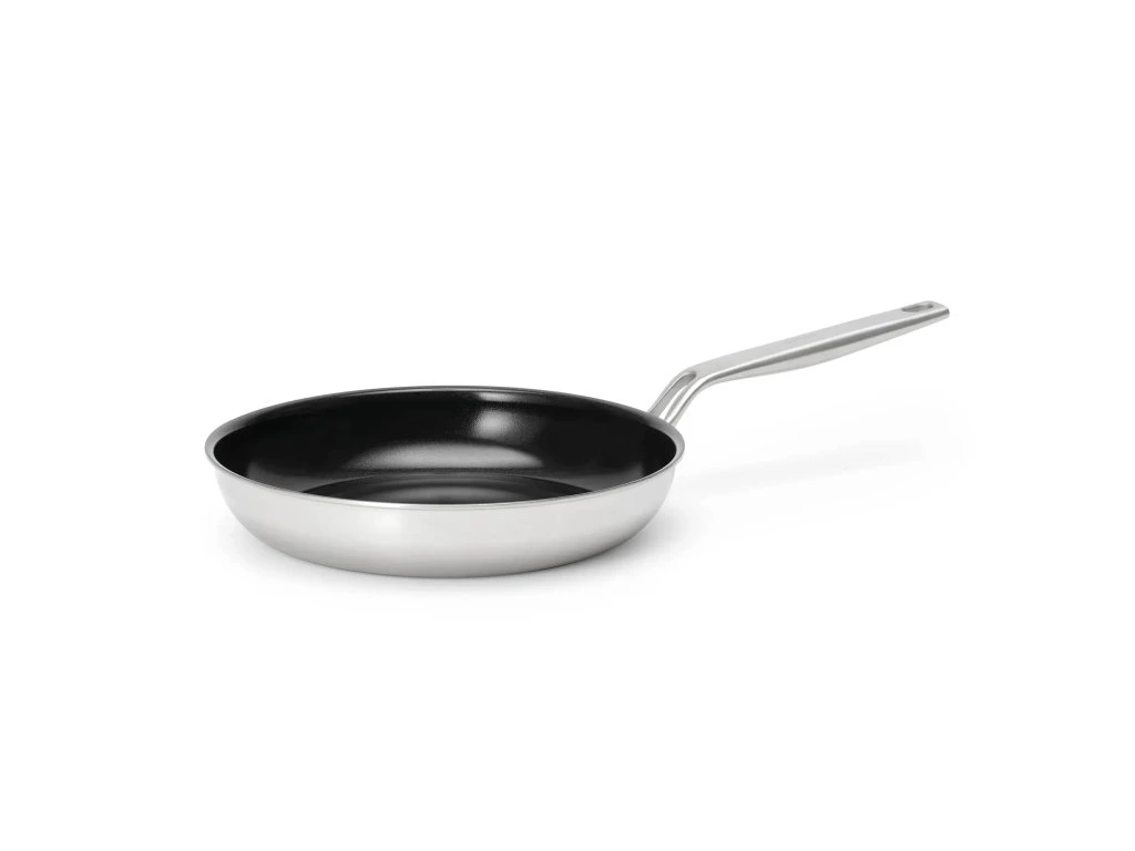 Гответе качествено и удобно на тиган от неръждаема стомана с незалепващо керамично покритие. Многослойната неръждаема стомана осигурява перфектно разпределение и задържане на топлината, като нагрява храната чак до краищата. А керамичното покритие предлага комфортно готвене без залепване.